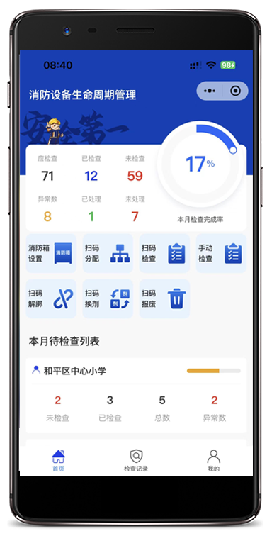 2、维保单位通过微信小程序进行消防设备检查,管理后台记录维护历史。